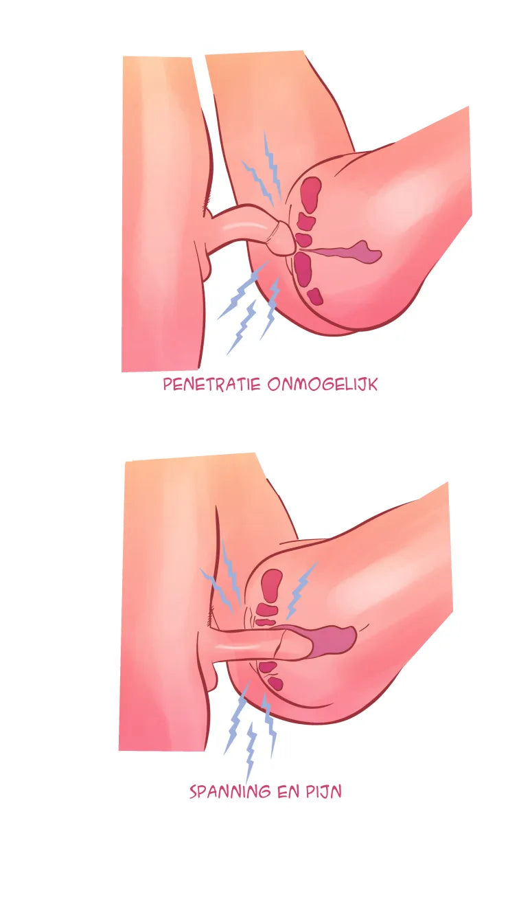 Het gaat bij vaginisme niet om een ‘beetje’ aangespannen spieren. Bij deze aandoening gaat het zover dat het bijna onmogelijk is gepenetreerd te worden. Afhankelijk van de mate van verkramping van de bekkenbodemspieren kan er soms nog wel een heel klein object, zoals een kleine tampon of vinger worden ingebracht, maar niet een penis. Maar soms is ook het inbrengen van een vinger onmogelijk.