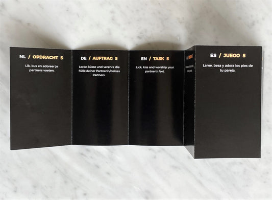 Met dit spel kun je seksuele fantasie de vrije loop laten. De controle nemen of onderworpen worden, waar gaat de voorkeur naar uit? De atrributen in dit spel zoals een blinddoek die ook als bondage lint gebruikt kan worden, een veer om te kietelen en een set handboeien, verscherpen je zintuigen op een speelse en fantasierijke manier. Het spel heeft een gebruiksaanwijzing in tien talen: Engels, Spaans, Frans, Duits, Nederlands, Pools, Russisch, Italiaans, Zweeds en Noors.