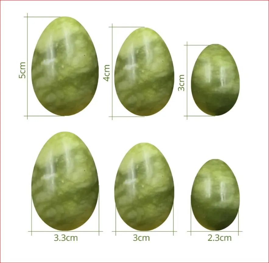 Het setje bevat drie yoni eitjes van natuurlijke groene jade in drie verschillende formaten. Het grote eitje is circa 3,3 bij 5 cm en weegt 72 gram, het middelste is circa 3 bij 4,3 cm en weegt 44 gram, en het kleinste is circa 2,3 bij 3 cm en weegt 20 gram. Alle drie de eitjes zijn doorboord en voorzien van een touwtje voor gemakkelijk verwijderen. Ze worden geleverd in een opbergtasje.